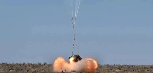 在距离地面1米左右的时候,反推发动机点火,产生一股强大的向上的推力,在最后和落地的几乎同时,反推发动机给返回舱一个“最后的托举”,把速度稳稳地降到每秒1-2米。
