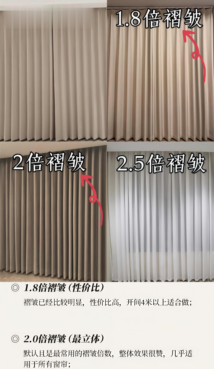 窗帘的褶皱就选∶1.8倍褶皱或者2倍褶皱,1.8倍褶皱(性价比高)褶皱已经比较明显,开间4米以上适合做;2.0倍褶皱(最立体)默认且是最常用的褶皱倍数,整体效果很赞,几乎适用于所有窗帘。