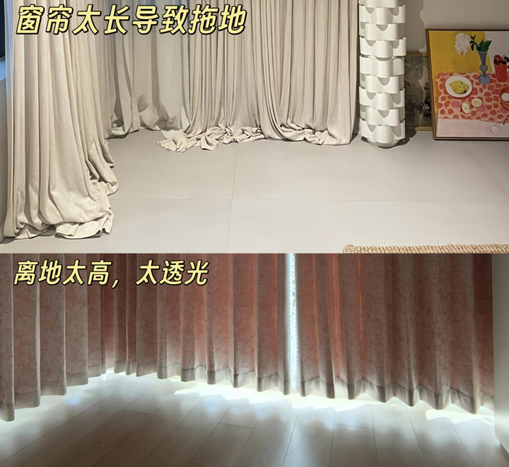 不要选∶窗帘太长或太短,窗帘太长长期拖地容易积灰发霉、绊脚还显邋遢;窗帘离地太高容易漏光漏风,视觉上妥妥的九分裤观感。