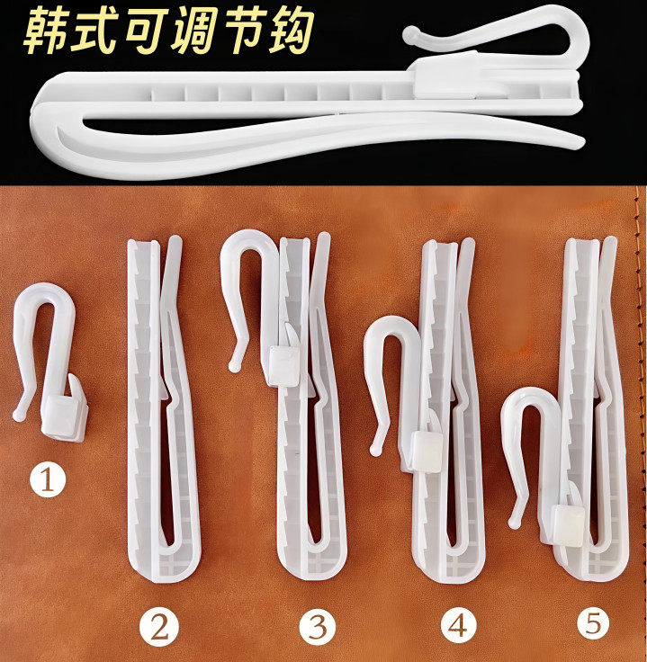 首选∶韩式可调节挂钩,钩子上有卡槽,可以调节高度,不做帘头的窗帘可以用调节的方法来调高遮住轨道。