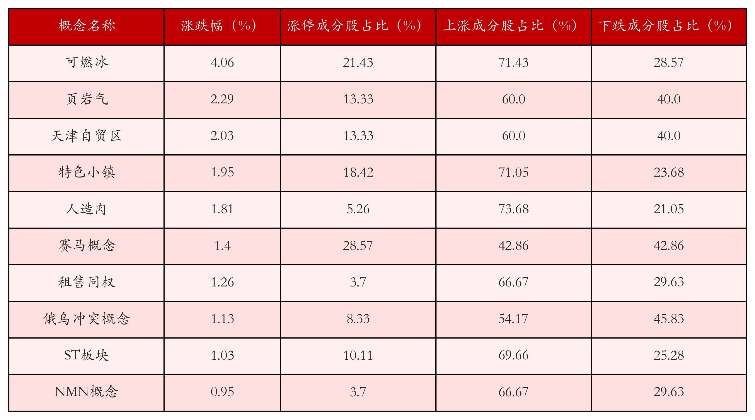 根据A股概念涨跌幅与所对应的股票池综合分析,涨幅靠前的三个概念板块分别为:可燃冰、页岩气与天津自贸区。排名前10位的概念板块相关数据见下表: