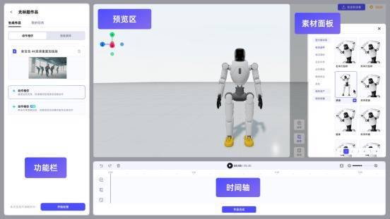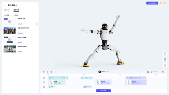 为了满足商业表演、导购等场景下对长序列、复杂任务的需求,“灵创”平台提供了一个类似视频剪辑软件的时间轴编排工具。用户可以将不同的动作、语音和表情片段进行自由组合与剪辑,像导演一样精确控制每一帧的节奏,从而创作出连贯的“机器人故事片”。