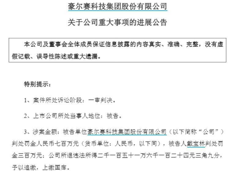 【大河财立方消息】11月5日,豪尔赛科技集团股份有限公司(证券简称豪尔赛)发布公告,披露公司及前董事长暨总经理戴宝林被提起公诉后续结果。